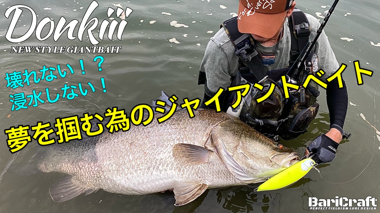 ドンキー ¥33,000 カラー パロットサファイア 全長 約245mm 自重 230g±(フックなし)※個体差があります タイプ フローティング アクション スラローム/ウェイキング/トップウォーター 推奨フック 3/0〜4/0 推奨リング #7〜#8 ワイヤー 1.6mm硬質SUS ボディ素材 発泡ウレタン/レジンコンポジットの2層構造 ※最薄部で約4mmの壁厚(マグロやGT用インジェクションルアーで2.5mm前後)で超高強度を誇ります。 ※当商品はフルハンドメイドで、細心の注意を払って製作してはおりますが、 【極小さなホコリなどの異物の付着】や【僅かな拭き取りや研磨時に出来る研磨傷】などがある場合がございます。 お求めの場合はこれらをご了承の上、ご購入下さい。 ジョイント系ジャイアントベイト全盛時代に個性的な1ピースボディのグライドベイト。 ・フックセッティング 【スイミングVer.】 フロント+センター 【ジャーキングVer.】 フロント+リア 【スイミングVer.】アクション ・タダ巻き 小さく、ターンが鋭角でロール混じりの不規則なS字。 ・潜行深度 0〜80cm ※多少、速い流れにも対応。 ・リーリングジャーク サーフェイスまたは水面直下でテーブルターン。 【ジャーキングVer.】アクション ・タダ巻き ジョイント系グライドベイト並みの大きなS字。 ・潜行深度 0〜50cm ・ジャーク 大きくスライド ※強く入力するとダイブし過ぎる為、慣れが必要 【共通】 ロッドを立てて、リーリングするとウェイキングしながらS字を描く。 ジャーキングVer.の方がウェイキングさせやすい 厳密にいうと、水中に入ったり出たりを繰り返す事により引き波を立てる為、慣れが必要。 【開発経緯】 製作者が50cm以上のボラの群れにバイトするアカメに投げるルアーの無力さや存在感のなさ、アカメが好むルアーの理屈を掘り下げて作り上げました。 【対象魚】 アカメ、シーバス、ヒラマサなどの10kg、20kgを超える大型フィッシュイーター 【実績】 大型フィッシュイーター全般 実績/アカメ30kgオーバー ヒラマサ メーターオーバー シーバス80アップ 245mmながら、ボディのみで230gある質量はインジェクションルアーで言うところの40cm級、ジョイントなどで折れ曲がらない事による水押し量はそれ以上の存在感があると考えています。 バリクラフトルアーらしく、扱いに慣れやコツが必要であり、マニュアル感のあるジャイアントベイトです。 是非、あなたの手で手懐けて下さい。 【注意点】ご購入前にご確認ください ・浮力についてはハンドメイドの為に個体差、塩分濃度、フック重量などの使用環境によって変化する場合がございます。 ・車中などの高温になる場所での保管はおやめください。 ・ハンドメイドルアーにつき、アクションに多少のバラつきがございます。 ※カラーについては画像とは色合いが少し異なる場合がございます。 ※カラーの仕様の変更をする場合は、添付画像の変更にてお知らせ致します。