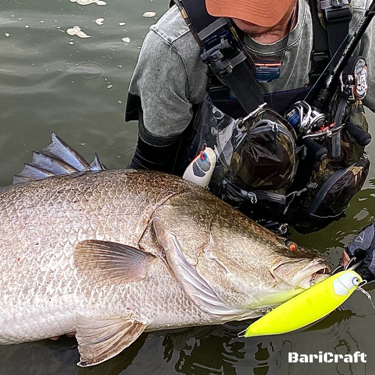 製作者が50cm以上のボラの群れにバイトするアカメに投げるルアーの無力さや存在感のなさ、アカメが好むルアーの理屈を掘り下げて作り上げました。